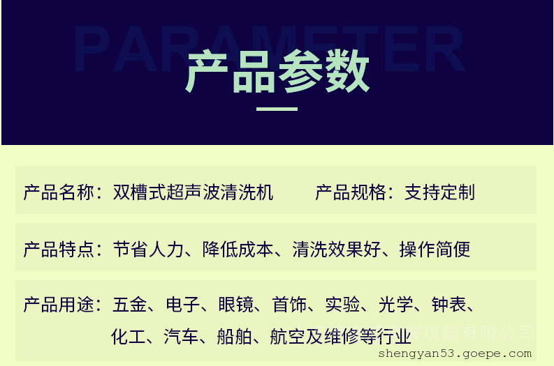| 超声清洗频率:40KHZ | | 清洗温度:常温-80 ℃ | | 工作方式:底部振动 | |